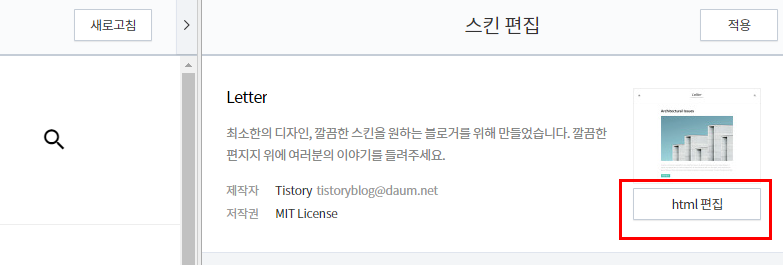 블로그 관리 -> 스킨 편집 -> HTML 편집