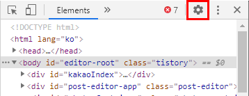 관리자 도구 F12 (= Ctrl+Shift+I) -> 오른쪽 상단 설정 (톱니바퀴모양)